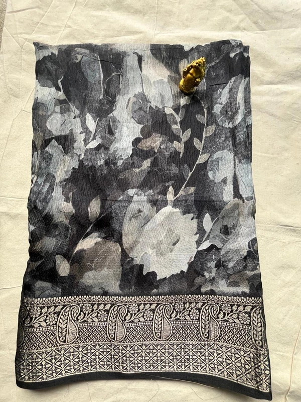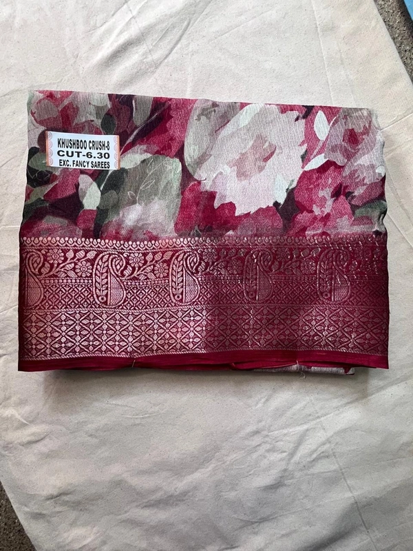 Made from premium crush fabric, these sarees feature digital floral prints and rich zari borders, offering a graceful blend of traditional and trendy appeal.