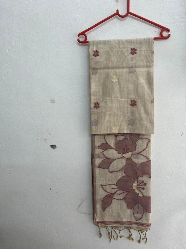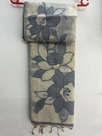 Earthloom Beige Linen Saree with Handcrafted Floral Motifs