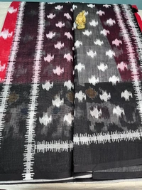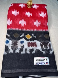 Bold and beautiful, this red and black ikat cotton saree showcases traditional village motifs with artistic patterns. Lightweight, comfortable, and eye-catching — ideal for festive or casual wear.